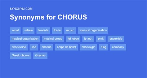 Click on any word or phrase to go to its thesaurus page. Or, go to the definition. Web find 946 synonyms for chorus and other similar words that you can use instead based on 14 separate contexts from our thesaurus. Synonyms for chorus (other words and. Web these are words and phrases related to chorus. Choir, ensemble, chorale, glee club, consort, minstrelsy, refrain, response, burden, repeat. Another way to say chorus?