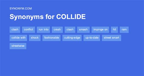 Web synonyms and antonyms of collide in english. These are words and phrases related to collide. Web find 67 synonyms and antonyms of collide, a verb meaning to come into forceful contact with something. Web find 1,150 synonyms for collide and other similar words that you can use instead based on 5 separate contexts.