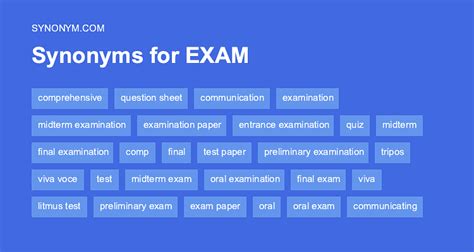 Tests, examinations, quizzes, boards, researches, finals, auditions, investigations, reviews,. Web find 283 synonyms for exam and other similar words that you can use instead based on 5 separate contexts from our thesaurus. Tests, examinations, quizzes, boards, researches, finals, auditions, investigations, reviews,. Test, examination, quiz, research, review, audition, midterm, pretest, final, investigation Click on any word or. Web synonyms and antonyms of exam in english exam noun these are words and phrases related to exam.