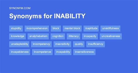 Words related to inability are not. Web find 176 synonyms for inability and other similar words that you can use instead based on 3 separate contexts from our thesaurus. Incapability, insufficiency, incompetence, incompetency, incapacity, disqualification, impotence,. Another way to say inability?