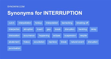 Browse related words to learn. Interval, hiatus, pause, gap, interlude, lull, discontinuity, intermission; Web words related to interruption are not direct synonyms, but are associated with the word interruption. Intervals, hiatuses, gaps, pauses, hiccups, hiccoughs, interludes, intermissions; “unless an interruption in service has been fully.