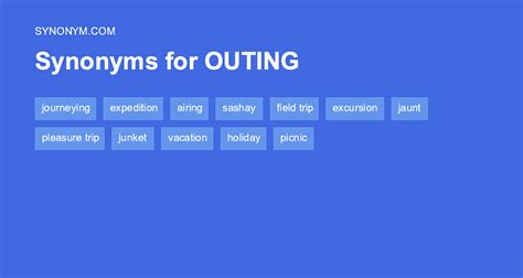 Another way to say outing? Excursion, tour, jaunt, sortie, expedition, junket, travel (s), walk; Synonyms for outing (other words and phrases for outing). Another way to say outing? Web find 948 synonyms for outing and other similar words that you can use instead based on 12 separate contexts from our thesaurus.