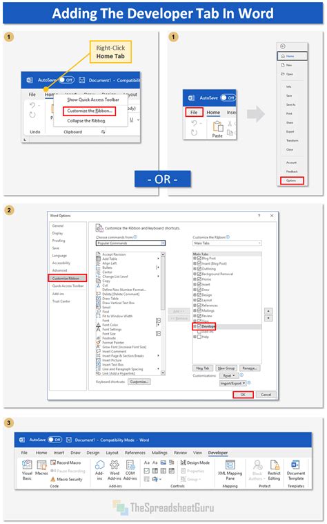 Word Developer Tab. Web show the developer tab in word on the file tab, go to options > customize ribbon. Web as its name implies, the “developer” tab in office programs allows you to create applications to use with office programs, write macros, run macros you.